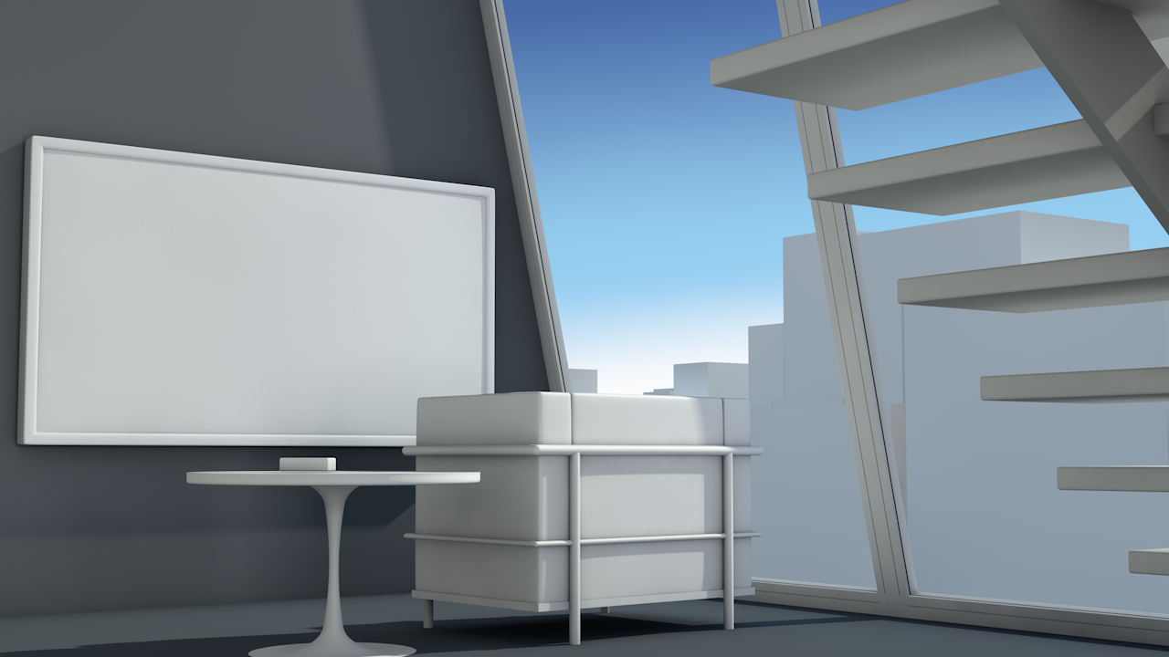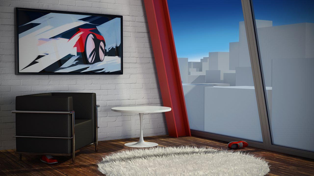 Creation of a scene. Inspired by the architecture and world of Mirror's Edge. Orignally I had intended the scene to be more 1984/Orwellian, but found that to be too heavy handed. I repurposed the room into a trendy, minimal loft space.