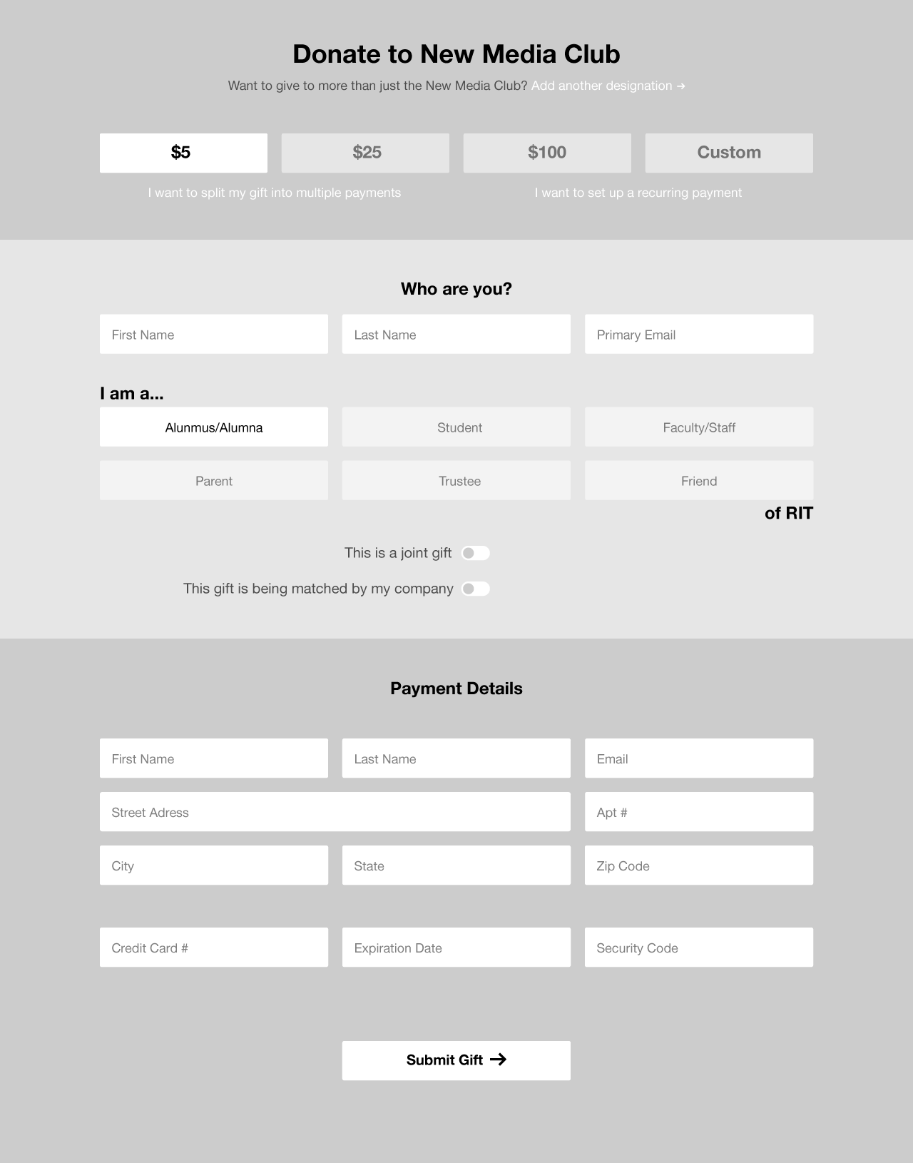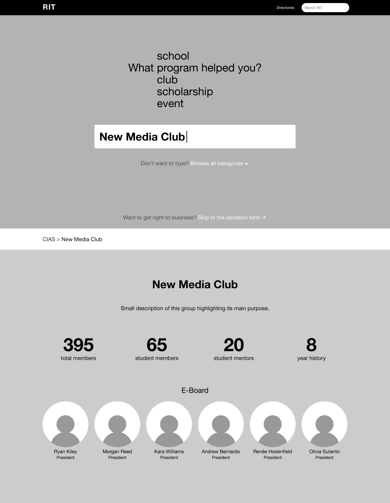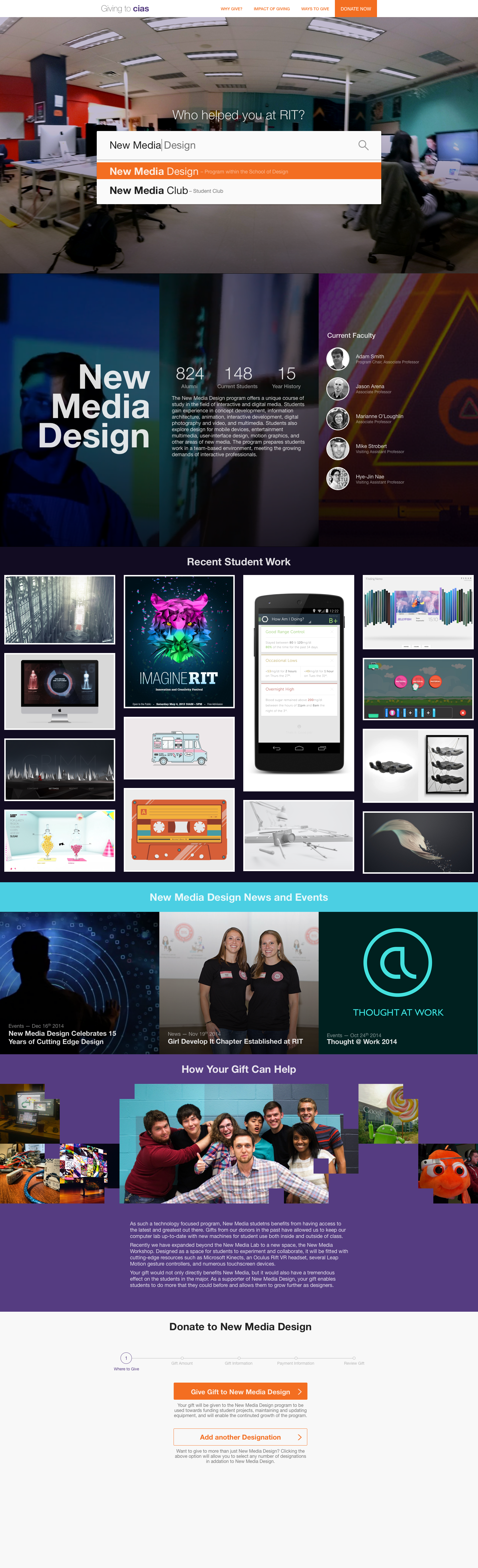RIT wants to increase it's rankings among other universities, but it currently has an alumni problem. Part of a university's rank is based on the number of donations it receives from its alumni. RIT's College of Imaging Arts and Sciences is particularly affected by this. I was tasked with designing a site that would help attract more alumni donations, as well as improve alumni relations in general.