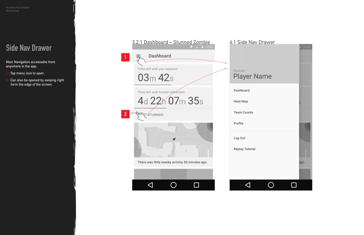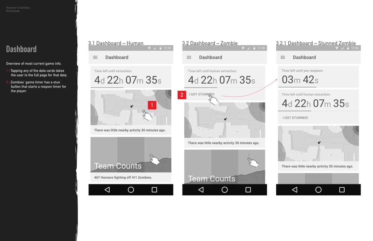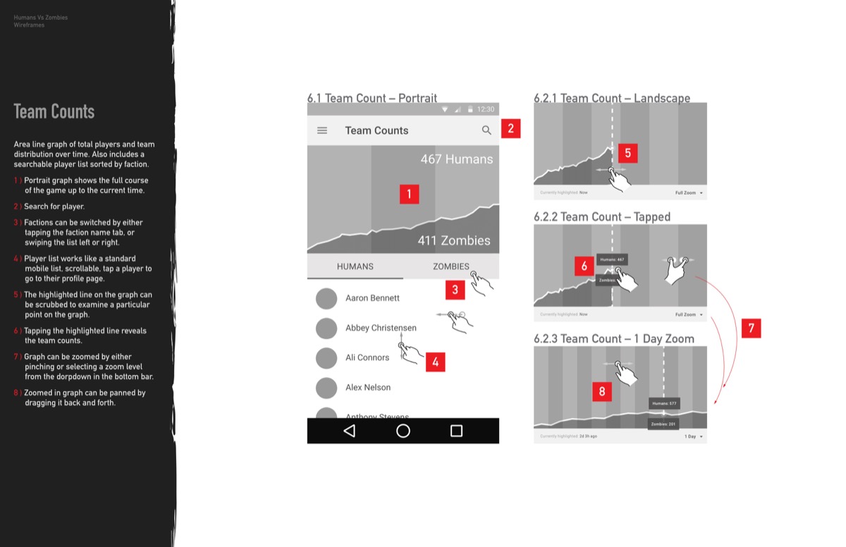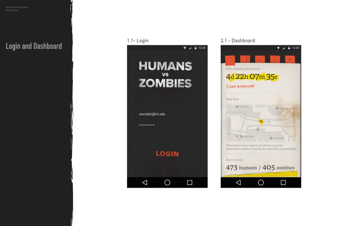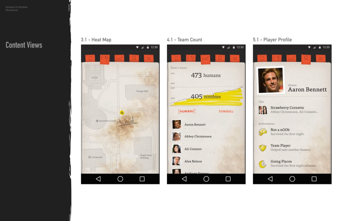 This project was created as a companion app for RIT's game of Humans vs Zombies played every semester. Designed to provide the player with information that can be used to create new strategies and counter-strategies, but balanced to not give too much information. For this project, we were given the goal of creating any kind of interactive work that "displayed information in multiple forms." Initially inspired by Google's recently announced Material Design Guidelines, I set to work.